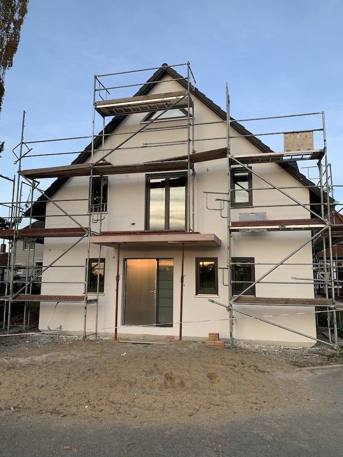 Seit mindestens zwei Wochen haben wir sie erwartet – unsere Fassadenbauer. Augenscheinlich gab es auch hier Lieferverzug beim Material. Wir haben uns für einen hübschen schlichten feinkörnigen Mineralputz entschieden. Am Freitag, den 29.10.21 wurde das Material endlich geliefert und direkt auf die Häuserwand aufgetragen. Wir hoffen, dass sie möglichst lange hübsch ausschauen wird.