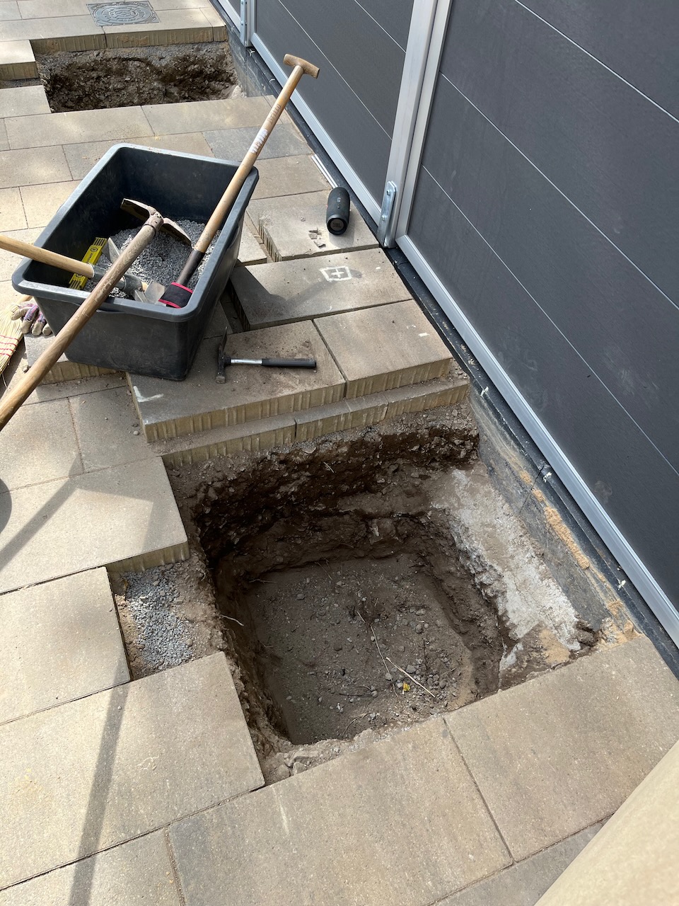 Wir warten auf die Betonlieferung. Sobald es gegossen wurde und eine Woche ausgehärtet ist, können wir das Carport fertig bauen. Ein Bewässerungssystem und eine Rasenfläche werden noch angelegt.