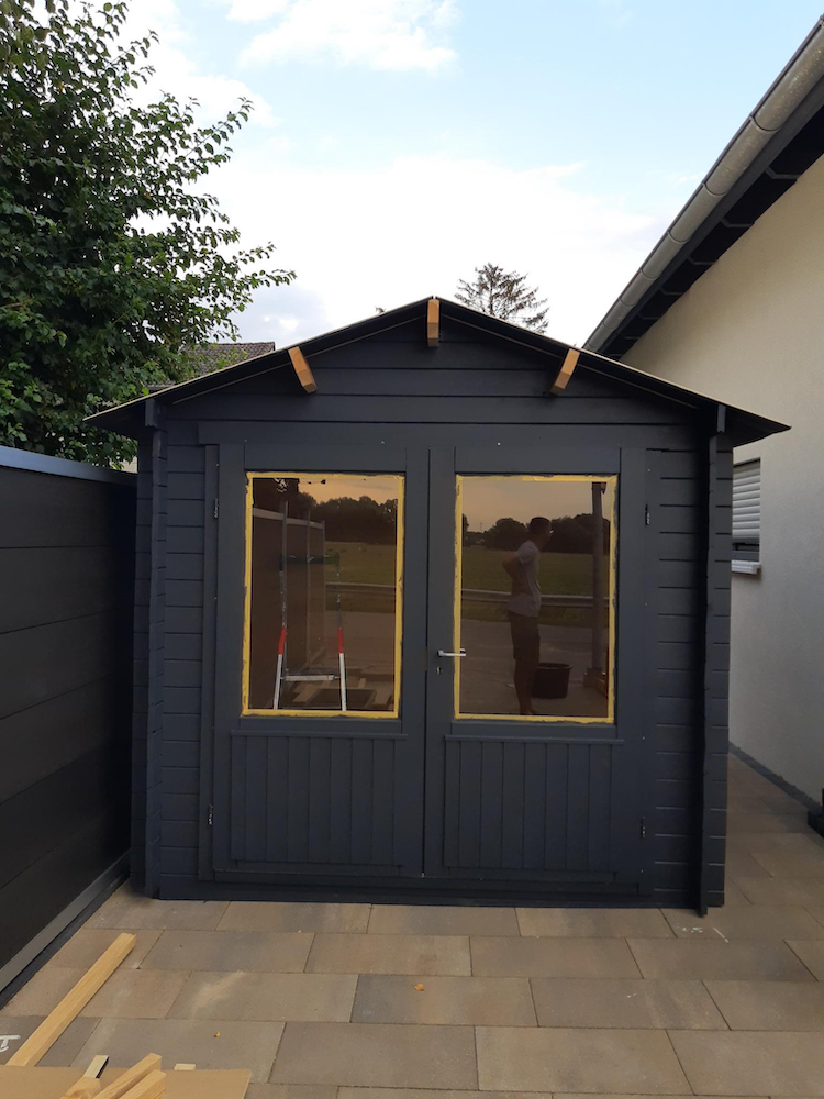 Leider gab es das Wunschmaß der Hütte nicht schon gestrichen, weshalb wir das selbst machen mussten. Immerhin waren wir froh ein Gartenhaus von dem Format so passend zu finden. Lasieren und Streichen umfasst jedoch deutlich mehr Zeitaufwand als gedacht, aber das Zusammenbauen geht locker an einem Tag. Das schwerste ist nur das Ausrichten der Hölzer bei dem Gefälle in der Einfahrt. Unser Gartenhäuslein ist richtig schick geworden:
