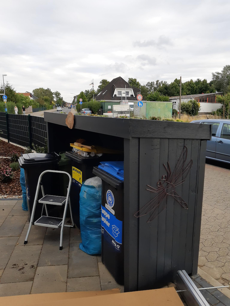 Verziert wurde der Mülltonnenstand mit Insektenhotels, einem selbstgebauten Namensschild geschenkt von meiner Freundin und ein wenig Deko.
