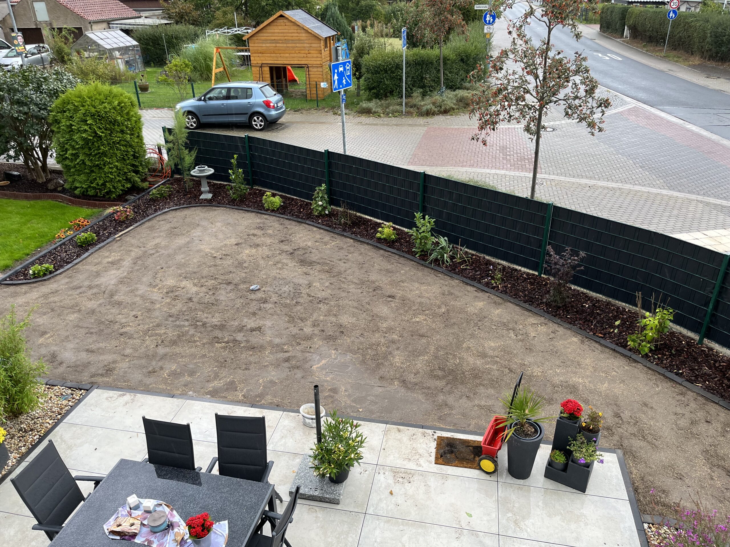 Der Gartenabschnitt rund um die Terrasse ist dieses Wochenende fertig geworden. Dank Unterstützung von Mama und Rolly konnten wir den Boden lockern, harken, säubern, walzen uuuuuuuuund den ersten Rasen säen. Ein Glück sind wir nicht aus Zucker und haben dem Wetter etwas strotzen können. Nun sorgt der Regen und unsere Bewässerung hoffentlich für einen guten Anwachs.