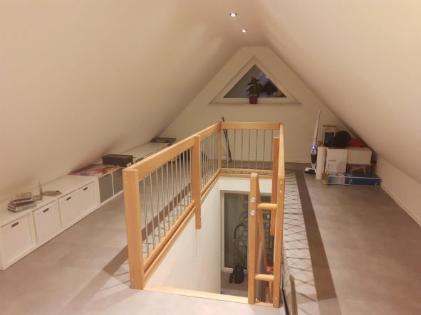 Ordnung gibt es nun auch auf dem Spitzboden. Seit dieser Woche ist unser Geländer da und wir konnten den Boden verlegen und erste Kisten sortieren.