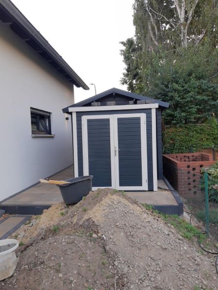 Inzwischen kam auch unser zweites Gartenhaus an. Dies war ein Fertigbausatz, der bereits gestrichen war. Der Aufbau ging daher zügig. Nun ist alles ordentlich an Ort und Stelle.